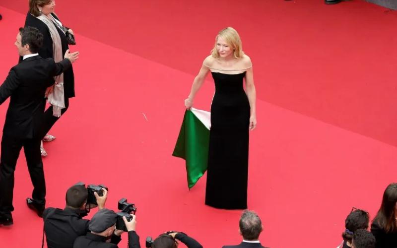 أثارت نجمة هوليود الأسترالية كيت بلانشيت الكثير من التكهنات لدى حضورها فعاليات مهرجان كان السينمائي العالمي يوم أمس الاثنين، حيث أطلت على الحضور بفستان قيل إنه يمثل ثلاثة من ألوان العلم الفلسطيني الأخضر والأبيض والأسود، بينما استكملت السجادة الحمراء باقي ألوان العلم.