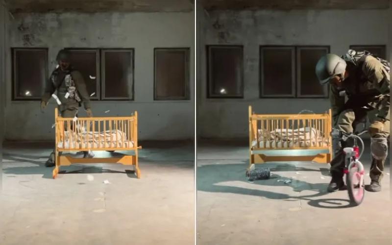 في المشهد الساخر الذي نشره عبر صفحته على "إنستغرام"، أدى دوبرولسكي دور جندي إسرائيلي يدخل مدججا بالسلاح إلى أحد المنازل في قطاع غزة ليجد طفلا رضيعا نائما على سريره فيقوم بتفخيخ السرير بالمتفجرات.