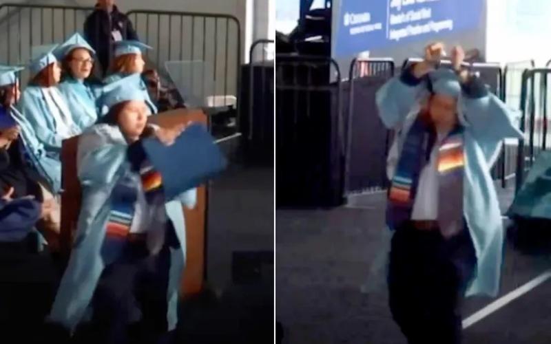 وأظهر مقطع فيديو، انتشر على منصات التواصل الاجتماعي، الطالبة وهي تصعد إلى المسرح وتتجه نحو المنصة مقيدة اليدين، وفور تسلمها شهادة التخرج رفعتها وقامت بتمزيقها بكلتا يديها.