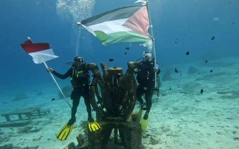 غواصان يرفعان علمي فلسطين وإندونيسيا في قاع مياه جزيرة إندونيسية
