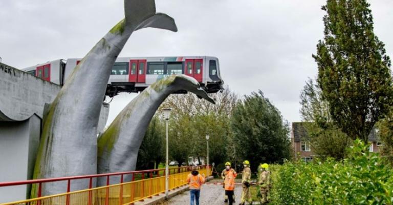 نجا قطار مترو هولندي من كارثة الاثنين بعدما اخترق حاجز توقف ليستقر عند مجسم عملاق لذيل حوت، ما جنب سائق المركبة التي كانت خالية من الركاب مصيرا أسود محتما. فقد أفلت القطار من خطر الاستقرار في المياه