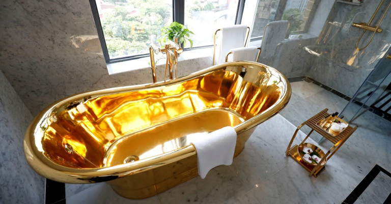 يرتشف نزلاء فندق "دولتشي هانوي غولدن لايك" في هانوي القهوة في فناجين مذهبة، ويستحمون في مغاطس مطلية بهذا المعدن النفيس. فقد فتح "أول" فندق مطلي بالذهب أبوابه في هانوي عاصمة فيتنام، ويعرب مالكوه عن