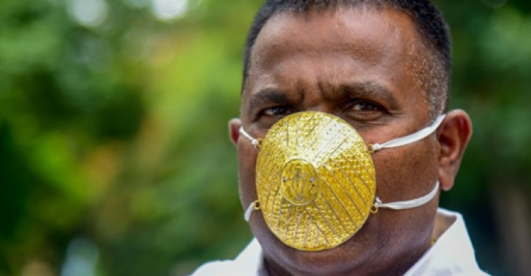 يضع رجل هندي كمامة مصنوعة من الذهب، معتقدا بأن هذا هو أفضل حل للوقاية من فيروس كورونا المستجد المتفشي بشكل كبير في الهند، معبرا عن حبه للمعدن الأصفر النفيس. وأوضح أن قيمة الكمامة الذهبية التي قام