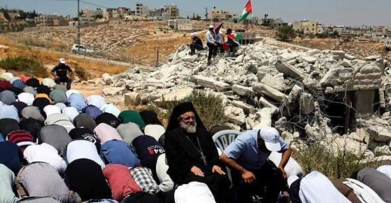 شارك الأب عبد الله يوليو كاهن رعية الروم الكاثوليك في رام الله المصلين الذين يؤدون صلاة الجمعة اليوم على انقاض المنازل المهدمة في بلدة صور باهر المقدسية. و نشر النائب طارق خوري عبر حسابه على تويتر