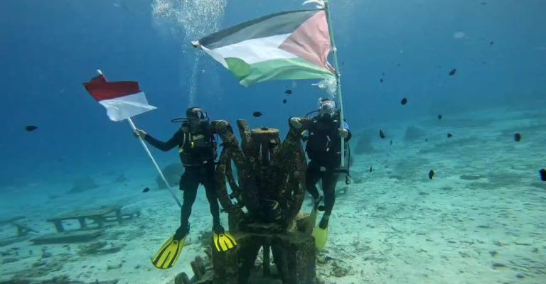 سابانغ – آتشيه – إندونيسيا- رفع ناشطان من مجموعة عمل الأقصى الإندونيسية العَلمين الفلسطيني والإندونيسي في قاع مياه جزيرة سابانغ أقصى غرب إندونيسيا، والتابعة لإقليم آتشيه الإندونيسي. وقام الشابان عارف