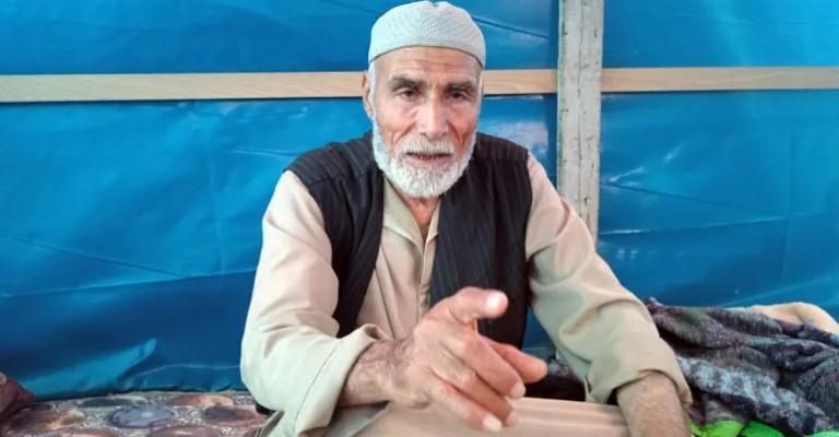 يجلس اللاجئ السبعيني عبد ربه أبو جبل في خيمة متهالكة بمنطقة المواصي المحاذية للبحر، غرب مدينة خان يونس جنوب قطاع غزة، بعدما اضطر إلى النزوح عن منزله بمدينة رفح على الحدود مع مصر، إثر إنذارات إسرائيلية