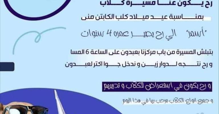 أصدر محافظ العاصمة ياسر العدوان قرارا يقضي بمنع مسيرة للكلاب كان من المقرر أن تتم في منطقة عبدون في عمان يوم بعد غد الأربعاء الخامس والعشرين من أيار الحالي، والذي يصادف يوم عيد الاستقلال. وبحسب منشور