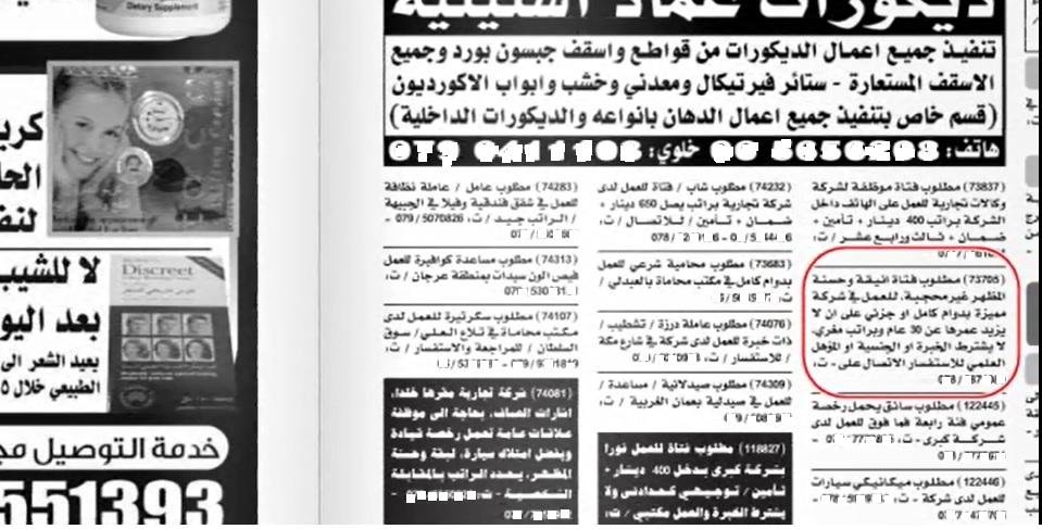 | نص إعلانين مختلفين1 ) مطلوب فتاة - للعمل لدى شركة والعمل مكتبي براتب 400 دينار + ضمان+ تأمين .2) مطلوب موظفة بدوام جزئي - براتب أسبوعي أو شهري- لا يشترط الجنسية أو العمر. |