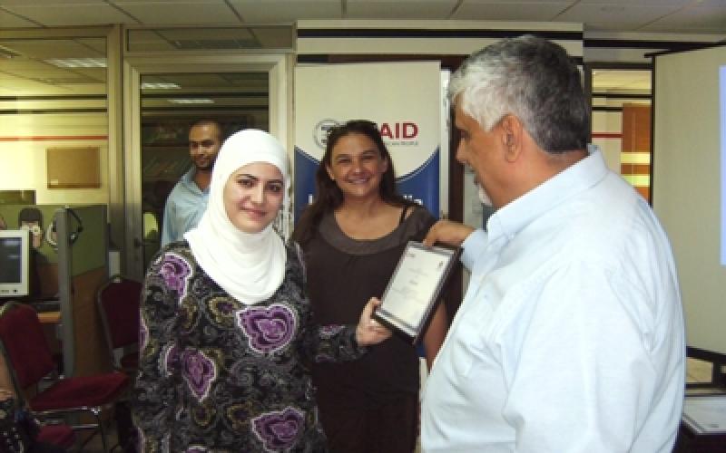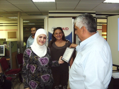 ملاحظة: شرح الصورة المرفقة: داود كتاب/ عمان نت، فرنشيسكا صوالحة/آيركس مع الفائزة ميسم صالح – تصوير مارينا البواب.