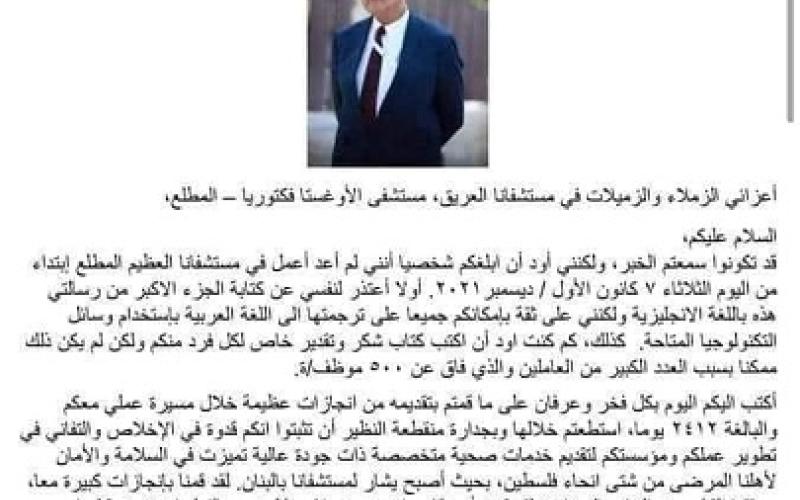الاتحاد اللوثري في القدس نشر بيان جاء فيه “الاستاذ وليد نمور ينهي منصبه كمدير تنفيذي عام مستشفى أوغستا فكتوريا -المطلع التابع للاتحاد اللوثري العالمي في القدس الشرقية اعتبارا من 7 كانون الأول/ديسمبر. يستمر الدكتور فادي الأطرش في منصب القائم بأعمال المدير التنفيذي للمستشفى.”