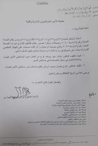 2022-04-14 قرر وزير الصحة الدكتور فراس الهواري تكليف الدكتور غازي شركس للقيام باعمال مدير مستشفى الامير فيصل.وانهى الهواري تكليف الدكتور نشات عمر فرح من العمل مديرا لمستشفى الامير فيصل واعادته للعمل في مجال اختصاصه في مستشفى البشير.