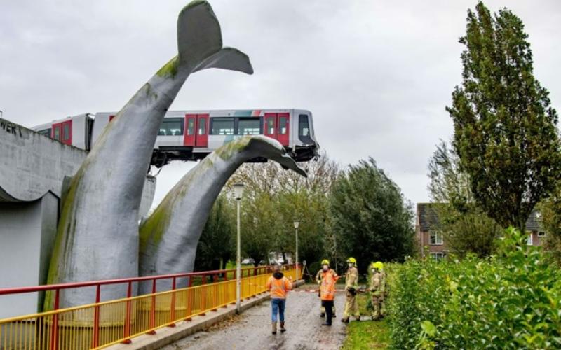 نجا قطار مترو هولندي من كارثة الاثنين بعدما اخترق حاجز توقف ليستقر عند مجسم عملاق لذيل حوت، ما جنب سائق المركبة التي كانت خالية من الركاب مصيرا أسود محتما.