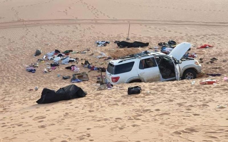 وتظهر الصور سيارة تغوص في الرمال، وبجانبها جثث، وتتناثر كافة أمتعتها في الصحراء، فيما قالت وسائل إعلام سودانية، إن الشرطة الليبية بالكفرة تلقت بلاغا بوجود جثث على بعد 400 كيلومتر من المدينة.