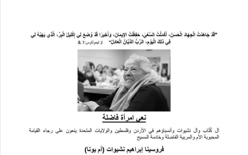 توفيت السيدة فروسينا إبراهيم نشيوات، والدة الزميل الصحفي داود كتاب مدير عام شبكة الاعلام المجتمعي، عن عمر يناهز ٩٥ عاما.
