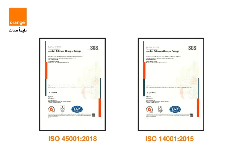 أورنج الأردن تؤكد ريادتها في معايير السلامة المهنية والبيئة بتجديد شهادتيّ الأيزو