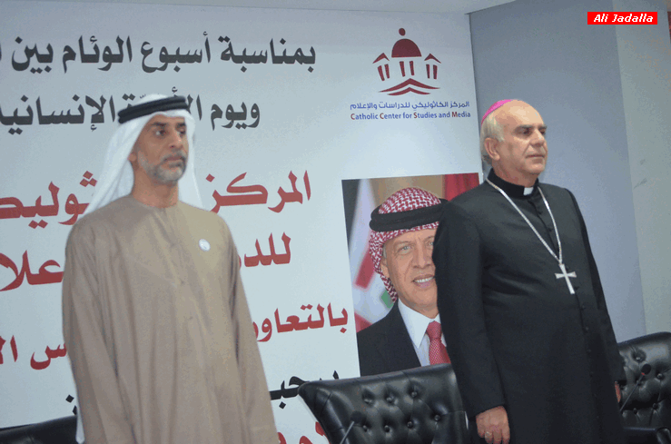 وفي كلمة معالي الشيخ خليفة بن محمد بن خالد آل نهيان سفير دولة الامارات العربية في عمّان، القاها السيد هاني بن هويدن القائم بالأعمال بالإنابة، تحدث فيها معاليه عن جهود الدولة وقيمها الثابتة من أجل نشر ثقافة التسامح والتعايش والإخوة الإنسانية ونبذ العنف والتطرف والكراهية وتحقيق السلام بين الشعوب. وشدّد على أنّ دولة الإمارات تؤكد على قيمها الثابتة في مواصلة العمل من أجل تحقيق السلام، ونشر ثقافة التسامح والإعتدال والتعايش بين الشعوب ونبذ العنف والتطرف والكراهية، وتغليب لغة الحوار والعقل والدبلوماسيّة وبناء جسور التواصل والتفاهم"، مشيرًا إلى أنّ دولة الإمارات "أعلنت في مثل هذا اليوم، الرابع من شباط من كل عام، موعدًا لمنح جائزة زايد للأخوة الإنسانية في أبوظبي، وذلك احتفاءً بجهود وإسهامات الأفراد والكيانات والمؤسّسات، التي تهدف إلى تقدم البشرية وإثراء التعايش السلمي في المجتمعات".