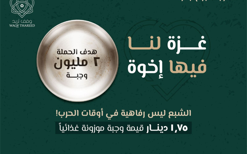 ويدعو وقف ثريد أفرادا ومؤسسات، إلى المشاركة في هذه المبادرة الإنسانية والخيرية، حيث أن كل تبرّع يُحدث فرقاً حقيقياً في حياة الأسر المتضررة، كما أن هذه الحملة ليست فقط لتقديم الطعام، بل أيضاً لتعزيز روح التضامن والأمل في مجتمعنا الأردني والعالم العربي، لنقف معاً لدعم غزة في مواجهة هذه الأزمة.