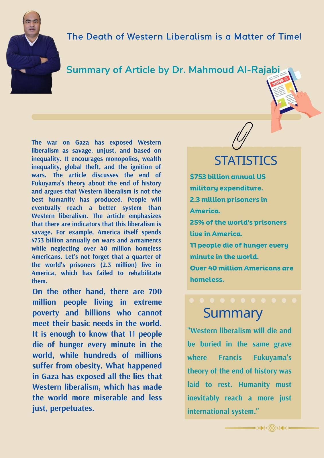 All of this leads us to ask: Is Western liberalism the pinnacle of civilization that humanity cannot surpass? Is it not time for humanity to reach a more just human system based on positive values and true equality?