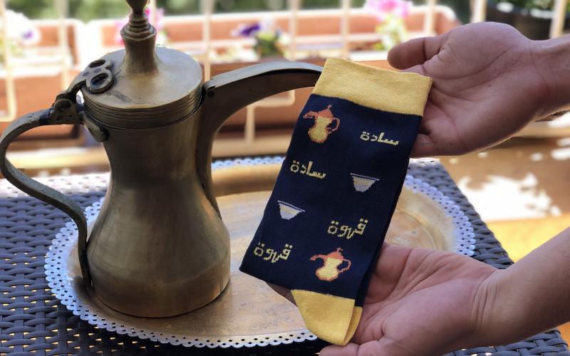 The two students offer socks with designs inspired from daily Jordanian life such as drawings of gas tanks Jordanians use for cooking or famous Jordanian dishes and sweets such as cotton candy.