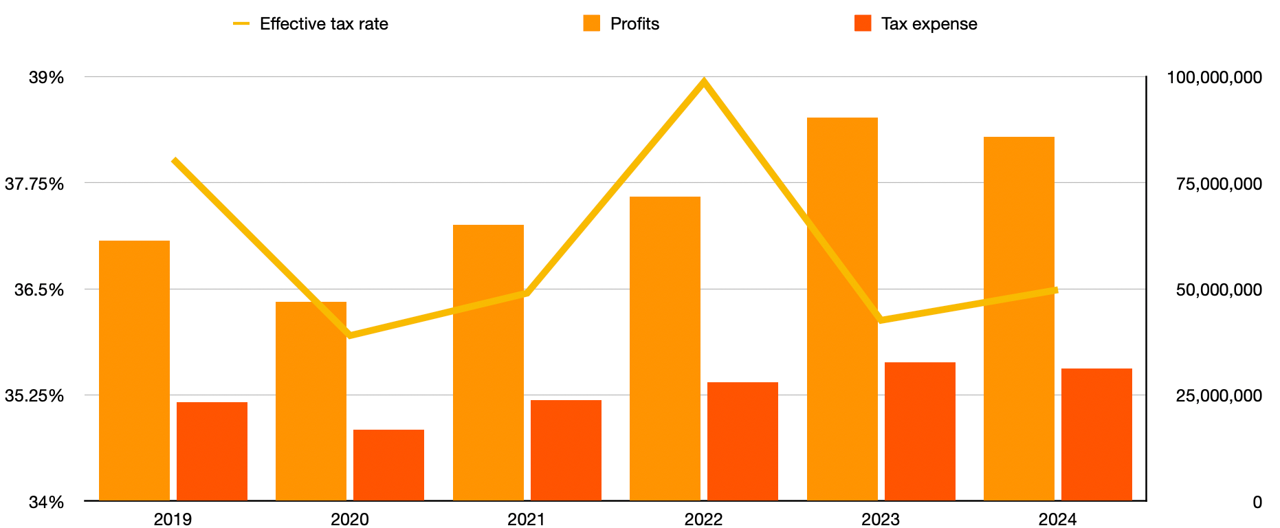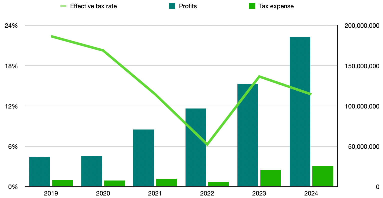 Capital Bank’s profits and tax payments (RHS) with the tax rate (LHS). Source: Capital Bank’s financial statements