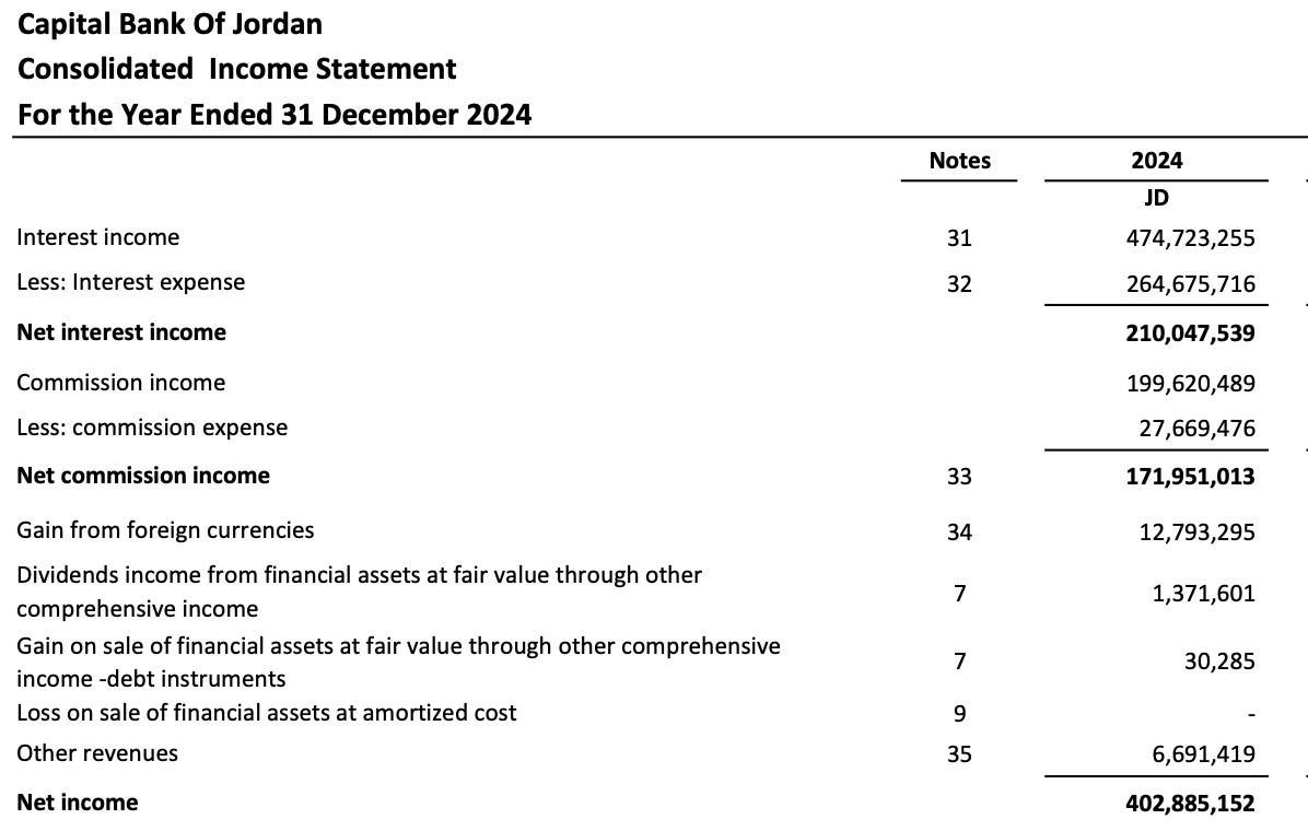 But, hang on, let’s go back to the first page and look at the ‘group’s’ total income: the consolidated statement shows that the total net income for 2024 was 402 million JODs (210 million net interest income and 170 million commissions and transfer fees, one of the highest among other banks).