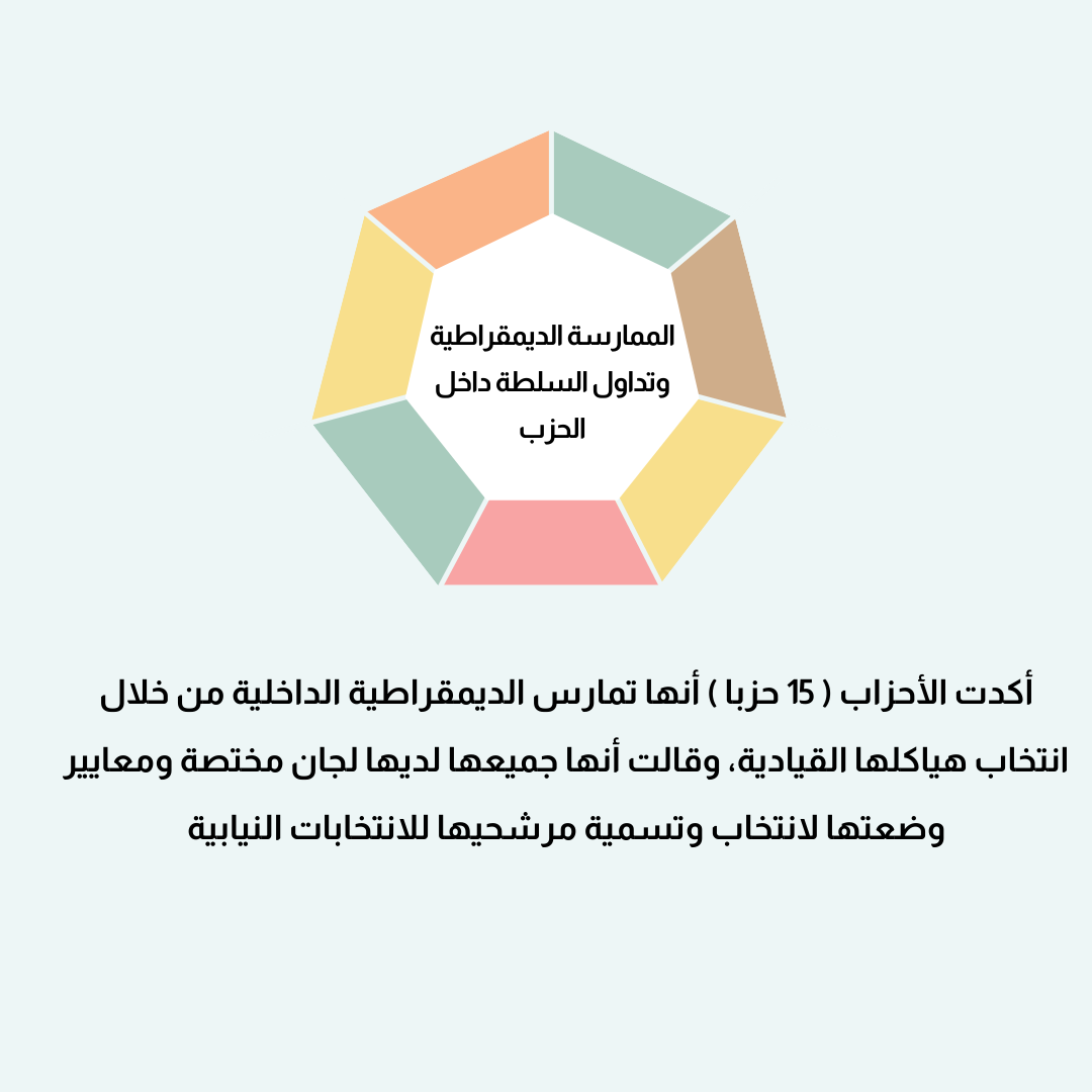 أكدت الأحزاب ( 15 حزبا) أنها تمارس الديمقراطية الداخلية من خلال انتخاب هياكلها القيادية، وقالت انها جميعها لديها لجان مختصة ومعايير وضعتها لانتخاب وتسمية مرشحيها للانتخابات النيابية.