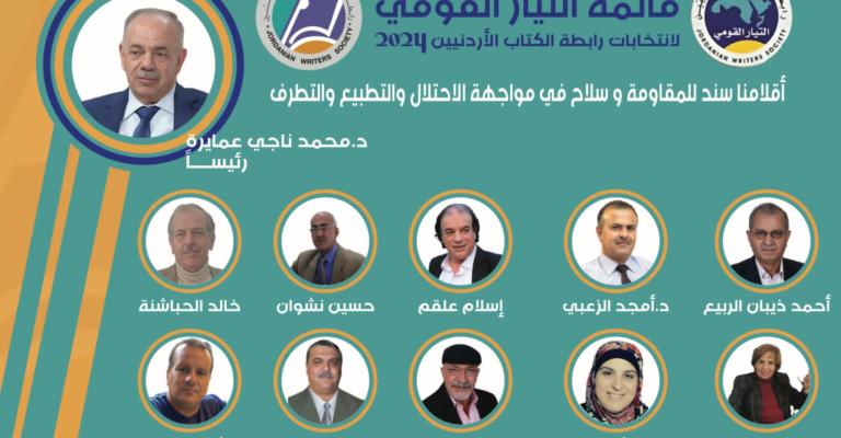 أعلن التيار القومي في رابطة الكتاب الاردنيين قائمة مرشحيه لانتخابات الهيئة الادارية للدورة ٢٠٢٤-٢٠٢٦ والتي تقام غدا السبت في المركز الثقافي الملكي، برئاسة الكاتب والشاعر والاكاديمي د. محمد ناجي عمايرة