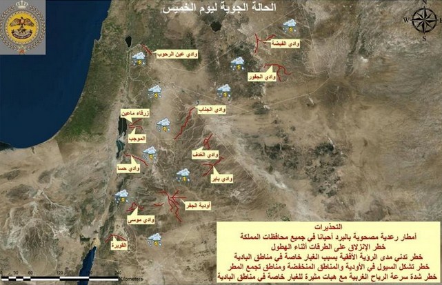 ونوه الى ارتفاع منسوب المياه في محاور الطرق الرئيسية والأنفاق في المدن الأردنية بما فيها العاصمة عمان، وتدني مدى الرؤية الأفقية على الطرق الصحراوية الدولية بفعل الغبار والأتربة المثارة، وكذلك تشكل الضباب والغيوم الملامسة لسطح الأرض في الطرق الجبلية.