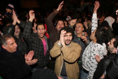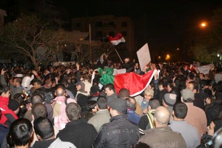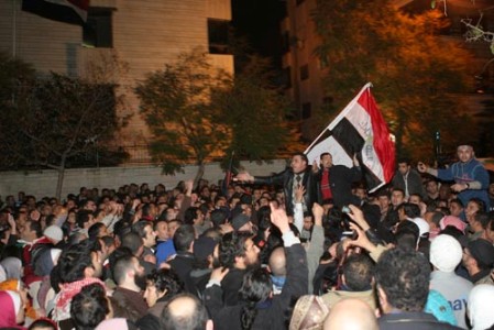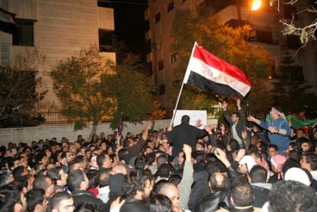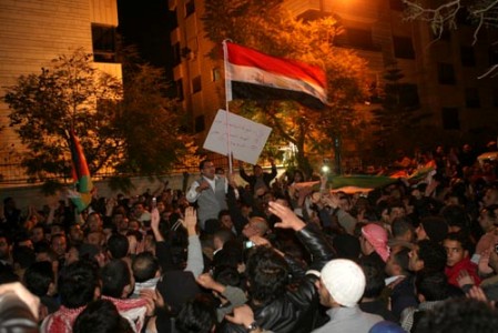 لم يكد ينتهي الإعلان عن تنحي الرئيس المصري حسني مبارك عن الحكم حتى بدأ المواطنون والفعاليات النقابية والحزبية والشخصيات الوطنية والثقافية، بالتوافد باتجاه السفارة المصرية تعبيرا عن فرحتهم بانتصار ثورة الشعب المصري ورحيل الرئيس المصري السابق حسني مبارك.