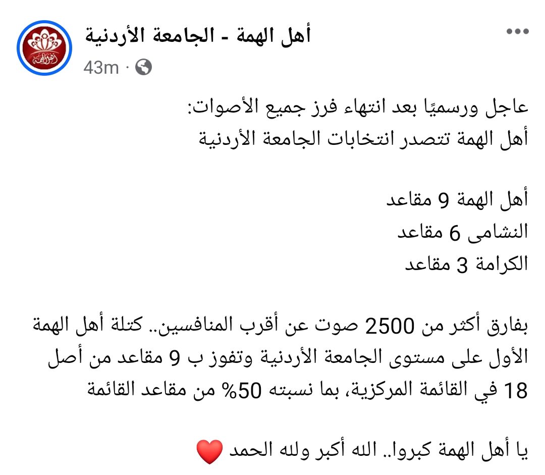تشير النتائج الأولية لانتخابات طلبة الجامعة الأردنية بأن قائمة "أهل الهمة" حصدت قرابة 50% من أصوات طلبة الجامعة الأردنية على مستوى الكليات، بعدد أصوات يتجاوز 10 آلاف صوت، وتحصد نصف مقاعد القائمة المركزية على مستوى الجامعة