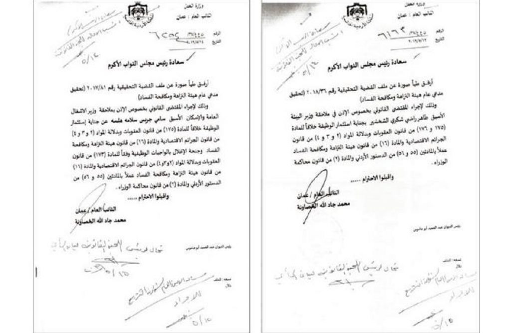 أكد المكتب الدائم في مجلس النواب إحالة رئيس مجلس النواب المهندس عاطف الطراونة لطلبين من النائب العام بملاحقة وزيرين سابقين، كان النائب العام أرسل بهما إلى مجلس النواب بتاريخ الرابع عشر من أيار الماضي، وفي تلك الفترة كان المجلس قد أنهى دورته العادية الثالثة ولم يكن المجلس في فترة انعقاد.