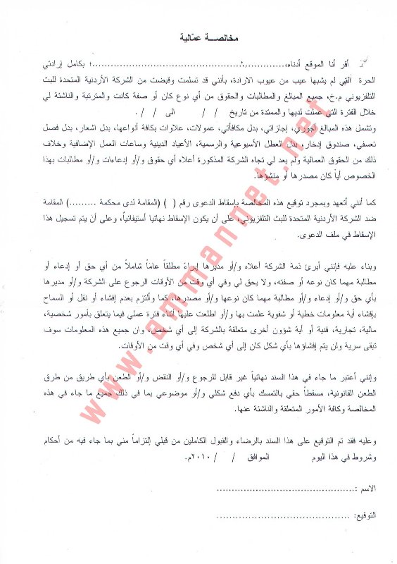 وقد حصلت "عمان نت" على نسخة من المخالصة العمالية والتي تشير إلى تبرئة ذمة الشركة أو مديرها إبراء مطلقا وأنه لا يحق للموظف في أي وقت كان الرجوع إلى الشركة أو مديرها بأي حق أو ادعاء أو مطالبة مهما كان نوعها أو مصدرها.