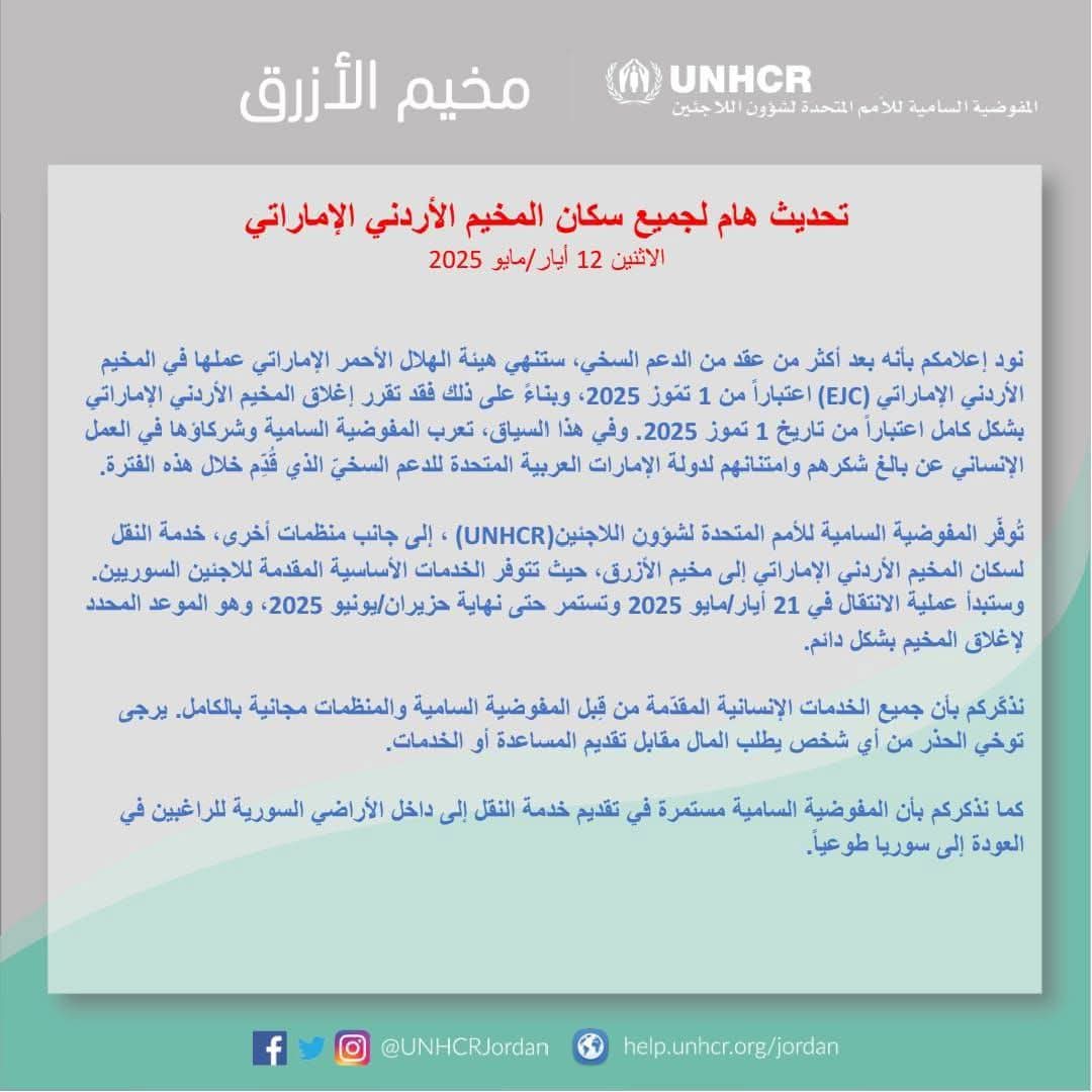 وأوضحت المفوضية في بيان صدر اليوم الاثنين 12 أيار/مايو 2025، أن هذا القرار يأتي بعد إبلاغ رسمي من دولة الإمارات العربية المتحدة بوقف الدعم المقدم للمخيم خلال الفترة القادمة. وأكدت المفوضية أنها، بالتعاون مع عدد من المنظمات الإنسانية الأخرى، ستقوم بتوفير خدمات النقل الداخلي لجميع سكان المخيم الإماراتي إلى مواقع أخرى ضمن مخيم الأزرق، حيث ستتوفر لهم الخدمات الأساسية المقدمة للاجئين السوريين.