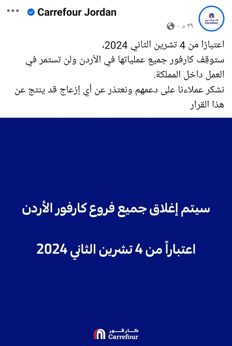 أعلنت كارفور الأردن أنها ستوقف عملياتها في الأردن ولن تستمر في العمل داخل المملكة.