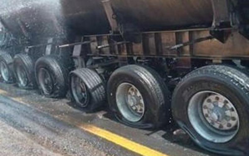 احتراق إطارات مركبة شحن محملة بالديزل على طريق العدسية
