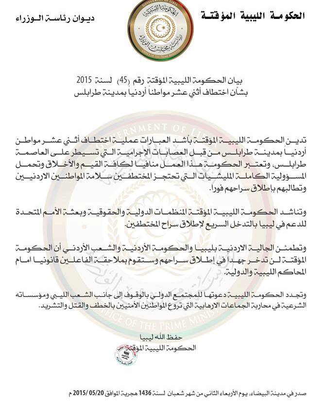 وأدانت الحكومة اللبيبة المؤقتة المعترف بها دوليا في بيان لها الأربعاء، الحادث "المنافي لكافة القيم والأخلاق"، محملة المليشيات التي تحتجز الأردنيين كامل المسؤولية عن سلامتهم، مؤكدة سعيها لإطلاق سراح المخطوفين، وملاحقة الفاعلين قانونيا.