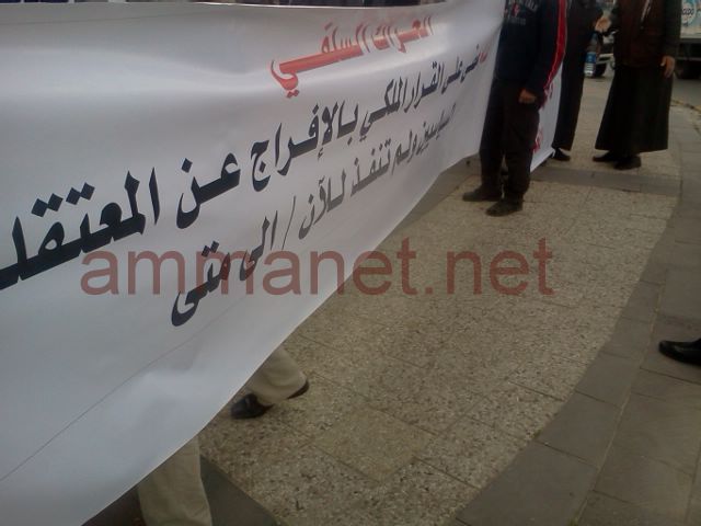 ورفع المشاركون في الاعتصام الذين لم يتجاوز عددهم الـ 50 معتصماً الرايات السوداء وشعارات تطالب بالافراج عن المعتقلين.