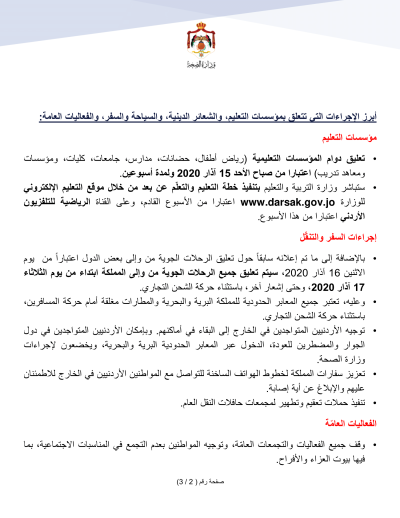 وكان وزير الصحة الدكتور سعد جابر، أعلن في وقت سابق الأحد، إصابة أردنيين اثنين، و4 سياح فرنسيين بالفيروس في الأردن، الذي دخل مرحلة احتواء الفيروس. وأضاف أن أحد المصابين الأردنيين جاء من بريطانيا، فيما خالط المصاب الثاني سائحة أميركية غادرت الأردن. "الحكومة أجرت فحوصا لـ 250 شخصا معظمهم عرب، والنتائج كانت سلبية،" بحسب جابر. "فرق التتبّع في وزارة الصحّة تتعقّب جميع المخالطين للمصابين، وتجري الفحوصات اللازمة للكشف عن حالاتهم"، بحسب جابر. وأضاف جابر لـ "المملكة" أن جميع المخالطين للسائحة الأميركية تم تتبعهم، وعددهم 28، أعداد المخالطين للمصاب الأردني القادم من بريطانيا 9 أشخاص. وأوضح جابر أن مواطنا أردنيا قدم من بريطانيا بتاريخ 8 آذار/ مارس، شعر بأعراض المرض عند الساعة الثانية عشرة منتصف الليل، حيث تم أخذ عينات وكانت النتيجة إيجابية، وتم وضعه في قسم العزل. وأشار إلى أنه وعند الساعة 3 فجرا، اشتكى سائح من الجنسية الفرنسية في أحد فنادق عمّان من ضيق في الصدر، وتم إرسال فريق للتأكد من وضعه وبرفقته 3 فرنسيين آخرين، حيث تم أخذ عينات من السياح الأربعة، وظهرت النتائج إيجابية الساعة 4 صباحا بمعنى أنهم يحملون الفيروس، وتم إدخالهم عند الساعة 5 صباحا إلى قسم العزل. وبالنسبة للحالة 6، قال جابر، إنها "لأردني خالط سائحة أميركية كانت قادمة من مصر، ومكثت في الأردن يومين، وغادرت بعدها"، لافتا إلى أنه "وبعد تلقي رسالة تفيد بإصابتها بالفيروس تم أخذ عينات من المخالطين لها في الفندق، وكانت نتيجة هذا المواطن ايجابية؛ والآن يعاد الفحص للتأكد وعلى الأغلب أنه مصاب بالفيروس". وأكد أن جميع الحالات المصابة أو التي نقلت المرض قادمة من الخارج، ونتوقع خلال اليومين المقبلين دخول آلاف المسافرين من الأردنيين القادمين من الخارج من مناطق موبوءة بالمرض، لافتا النظر إلى أنه سيتم إعطاء كل واحد منهم تعليمات الحجر المنزلي، وتعهد بالبقاء في المنزل، وفي حال ظهور أي أعراض، سيقوم فريق الرصد الوبائي باتخاذ الإجراءات اللازمة من ناحية تطهير المكان، وأخذ العينات منه ومن المخالطين. الحكومة أعلنت السبت مجموعة إجراءات وقرارات جديدة اتخذتها الحكومة للتعامل مع فيروس كورونا المستجد، تتضمن تعليق دوام المؤسسات التعليمية لمدة أسبوعين. 83 حالة في الحجر الصحي وذكر البيان أن عدد الحالات الموجودة حالياً في الحجر الصحي 83 حالة، فيما وصل العدد الكلي للحالات التي أُدخلت الحجر الصحي ثم غادرته بعد قضاء 14 يوماً وثبوت عدم إصابتها بالفيروس 303 حالات. الوزير جابر، قال عبر برنامج "صوت المملكة" الأحد، إنه يتم البحث حالياً عن فندق آخر للحجر الصحي، ليستضيف الأردنيين القادمين من بريطانيا، مضيفاً أن قدرة الأردن على الحجر تتراوح بين 250 إلى 350 حالة. وذكر: "وجدنا أن بريطانيا بؤرة مصدرة للفيروس "، مضيفاً أن 3 طائرات قادمة من بريطانيا ستصل الاثنين. وتوقع الوزير جابر وصول آلاف الأردنيين قبل تعليق الرحلات الجوية يوم الثلاثاء، دون أن يحدد العدد المتوقع. وقال الوزير جابر "نعتقد أن القادمين من بريطانيا سيتم الحجر عليهم صحيا". المملكة قد يعجبك أيضاًتوصيات وداعا للعمليات الجراحية المتعبة! الحل النهائى لبشرة نضرة من غير تجاعيد!! Goji Beauty كيف تبدين10 سنوات أصغر من قبل؟ كريم غوجي هل أنفقتِ 500 دينار لتبدين أصغر 15 عامًا؟ هذا الكريم المذهل يقوم بهذه الوظيفة وبسعر أقل Goji Cream تمتعي بإطلالة شبابية في أي سـن !! Goji Cream وداعا للعمليات الجراحية المتعبة! الحل النهائى لبشره نضره من غير تجاعيد!! كريم غوجي استمتعي ببشرة مثل بشرتي: جميلة وناعمة وصحية من جديد! مجرب وفعال هـل تنفقين مئات الدنانير لتبدين أصغر بخمسة عشرعامًا ؟ إليك الحل الأمثل و الأوفر Goji cream التعليقات الاسم : * التعليق : سيتم عرض التعليقات بعد مراجعتها من قبل الإدارة آخر الأخبار لجنة الأوبئة: قد يكون هناك حالات جديدة بكورونا في الأردن لا نعلم عنها بعد لجنة الأوبئة: قد يكون هناك حالات جديدة بكورونا في الأردن لا نعل