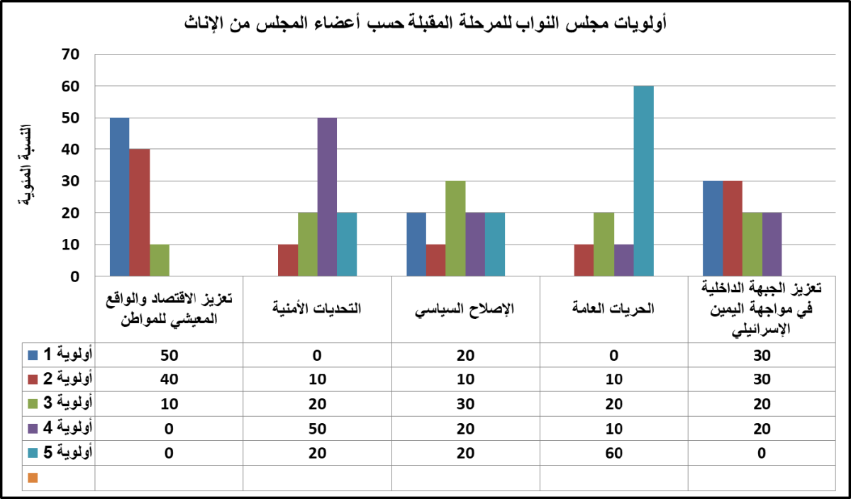 في المقابل تصدر تعزيز الاقتصاد سلم أولويات النواب الإناث في المجلس للمرحلة المقبلة بفارق واضح عن أولوية تعزيز الجبهة الداخلية في مواجهة اليمين الإسرائيلي، بحسب الرسم البياني التالي: