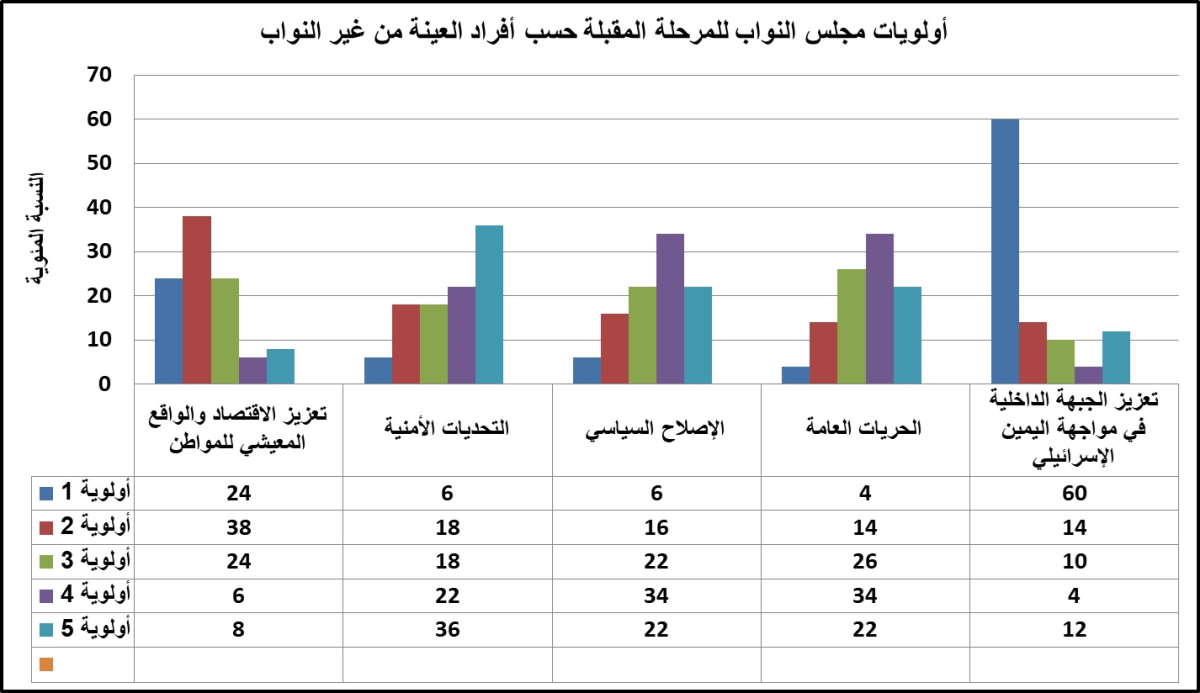 بحسب نتائج الاستطلاع الذي شمل 50 نائبًا، تصدّر تعزيز الاقتصاد، يليه تعزيز الجبهة الداخلية في مواجهة تهديدات اليمين الإسرائيلي، أولويات مجلس النواب للمرحلة المقبلة، فيما احتل الإصلاح السياسي والتحديات الأمنية مرتبة وسطى في أولوياتهم للمرحلة المقبلة، فيما جاءت الحريات العامة في أدنى سلّم أولوياتهم، كما يظهر في الجدول التالي: