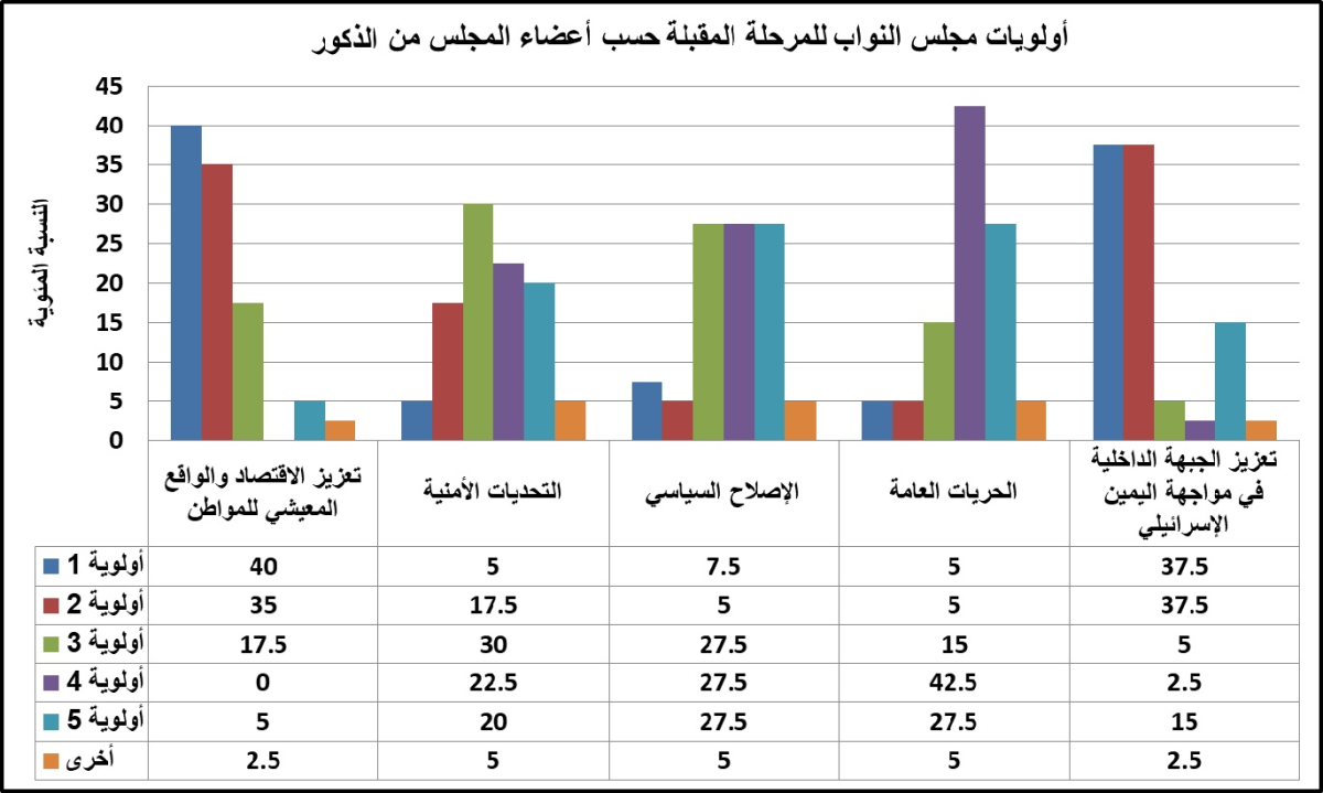 بحسب النتائج، فإن تعزيز الاقتصاد وتحسين الواقع المعيشي هو الأولوية الأولى لمجلس النواب، لكنها لا تبتعد كثيرا عن أولوية تعزيز الجبهة الداخلية في مواجهة خطر اليمين الإسرائيلي بحسب أعضاء المجلس من الذكور بحسب الرسم البياني التالي:
