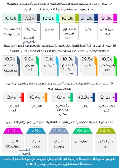 وبما يتعلق بإجراءات الحكومة تجاه قطاع التكنولوجيا والتعليم عن بعد فقد بينت النتائج أن 19.3%من المستجيبين مستخدمي "منصة درسك" راضين بشكل كبير عنها كمنصةٍ خاصة بالتعلم عن بعد، فيما عبر 31%عن رضاهم عن منصة درسك، بينما قال 13.6%أنهم غير راضيين عن المنصة، فيما وصلت نسبة غير الراضيين أبداً إلى 7.3%من المستجيبين، وفيما يتعلق بالخدمات الإلكترونية التي قدمتها الحكومة خلال التعامل مع أزمة كورونا فقد بينت النتائج أن 21.8%من المستجيبين راضين بشكل كبير بينما وصلت نسبة الذين قالوا أنهم راضون إلى 48.4%من المستجيبين، وكانت نسبة غير الراضين وغير الراضين أبداً 13.8%من مجموع المستجيبين.