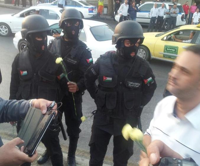 وهتف المعتصمون " هات يا شعبي هات.. معتقلات معتقلات" و" يا عبد الله بدنا قرار.. بدنا يطلعوا الاحرار" و " احبس واضرب يا ابن حسين .. هذا كله دين بدين"و " يا عبد الله يا ابن حسين.. افرج عن المعتقلين".