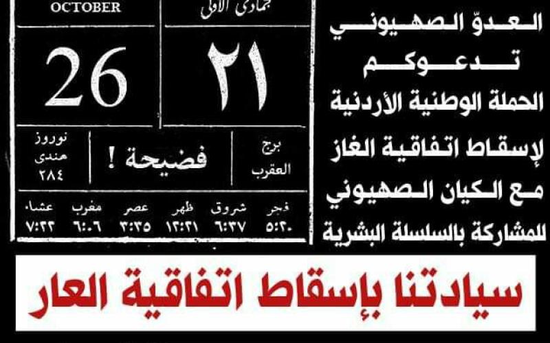 ودعت “حملة غاز العدو” للاحتجاج أمام شركة الكهرباء يوم السبت26 أكتوبر وذلك تزامناً مع الذكرى الــ 25 لتوقيع معاهدة السلام (وادي عربة) مع الاحتلال الإسرائيلي تحت شعار “سيادتنا بإسقاط اتفاقية العار”.