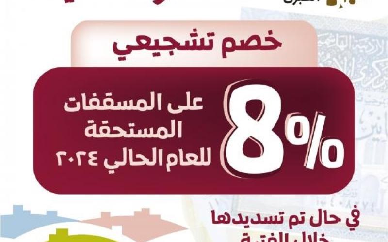 أعلنت أمانة عمان الكبرى عن خصم 8% على المسقفات المستحقة للعام الحالي 2024، في حال الدفع قبل نهاية شهر شباط المقبل.