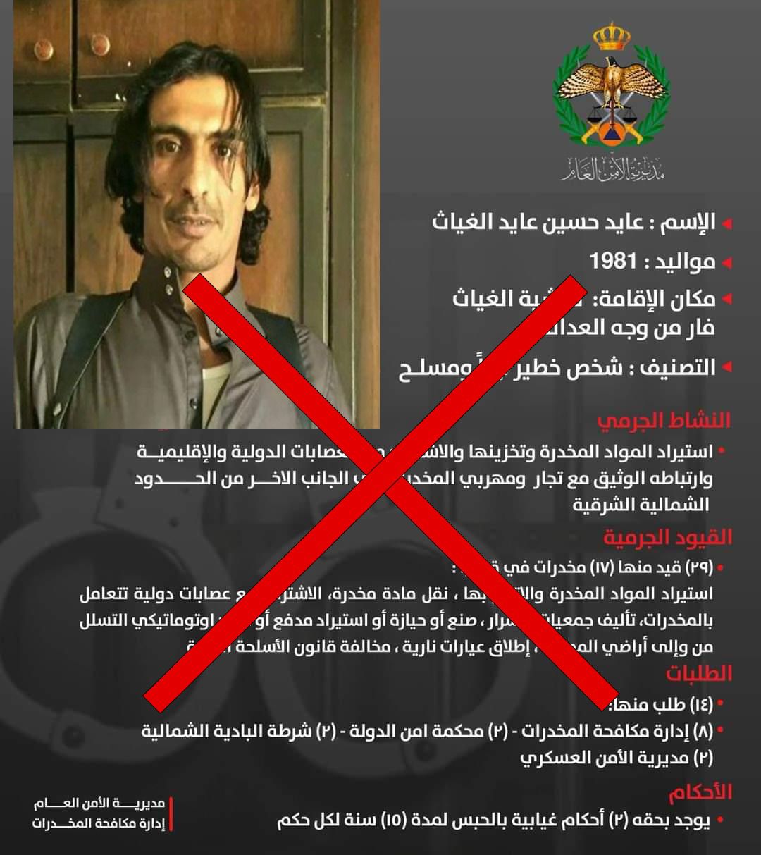 وأكّد الناطق الإعلامي أنّ المداهمة جاءت بعد جهد عملياتي واستخباري جرى خلاله تحديد مكان وجود المطلوب ( عايد حسين عايد الغياث ) والمطلوب ب 14 طلبا بقضايا استيراد المواد المخدرة والاتجار بها والاشتراك مع عصابات دولية وإقليمية وتأليف جمعيات الأشرار وإطلاق عيارات نارية وضبط بحوزته سلاح ناري اوتوماتيكي وكمية من الذخيرة .