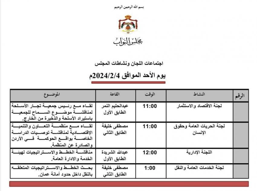تعقد عدة لجان نيابية الأحد اجتماعات لبحث قضايا وملفات ضمن جدول أعمالها، حيث تجتمع لجنة الاقتصاد والاستثمار مع رئيس جمعية تجار الإسلحة لمناقشة موضوع السماح للجمعية باستيراد الاسلحة والذخائر من الخارج .