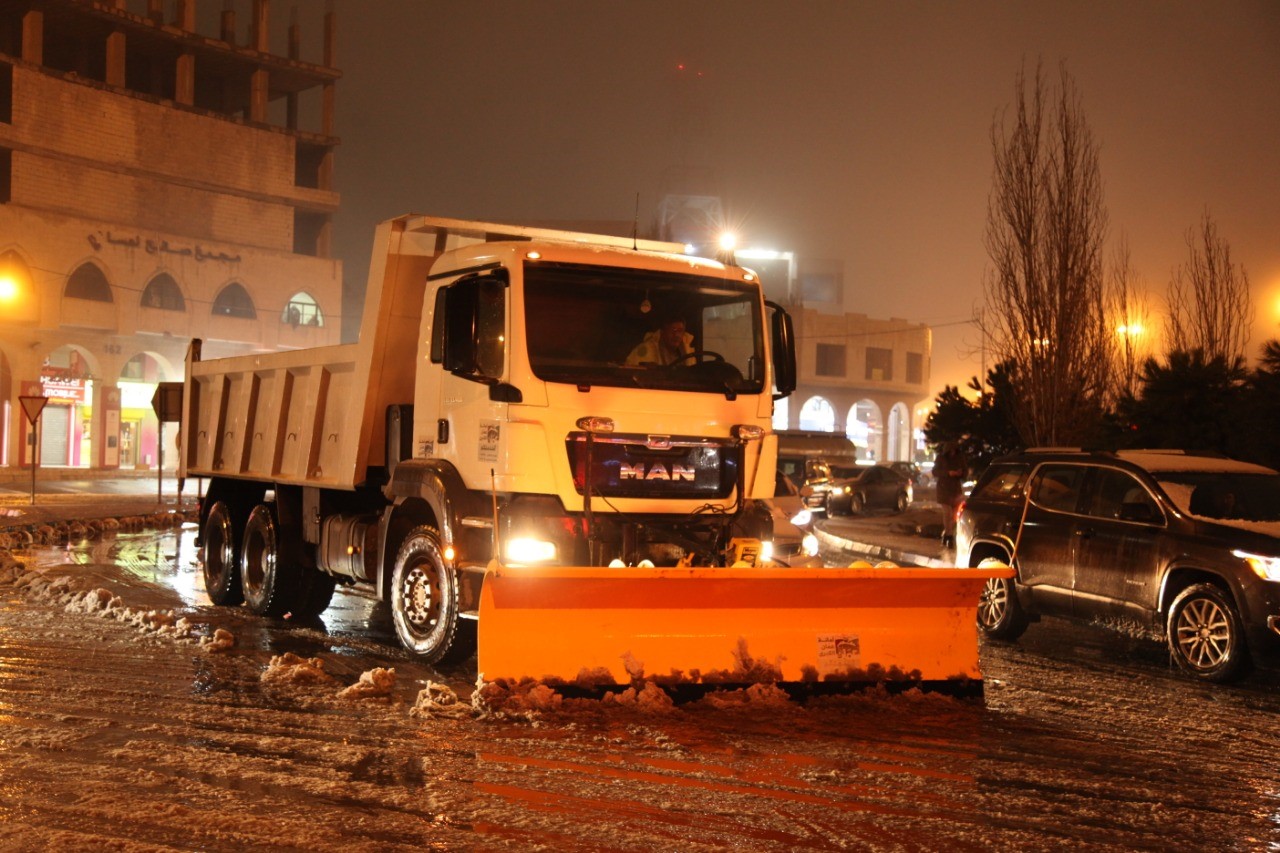 وباشرت فرق امانة عمان من خلال 36 مسار مثبت في غرفتي الطوارىء تلاع العلي وراس العين على التعامل مع الثلوج اول باول على الشوارع الرئيسية في العاصمة عمان فيما يتركز عمل الغرف الفرعية في المناطق على فتح الشوارع داخل الاحياء السكنية .