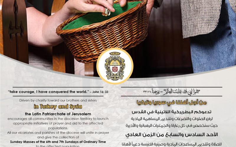 وجّه البطريرك بييرباتيتسا بيتسابالا، بطريرك القدس للاتين، رسالة إلى المؤمنين وذوي الإرادة الصالحة في أبرشيّة البطريركيّة اللاتينيّة في القدس، قال فيها بأنّ البطريركيّة خصّصت تبرعات قداديس الأحد 12 شباط والأحد الذي يليه 19 شباط الحالي، من أجل المساعدة الإنسانيّة للمتضرّرين جراء الهزة الأرضية التي تعرّضت لها تركيا وسوريا.