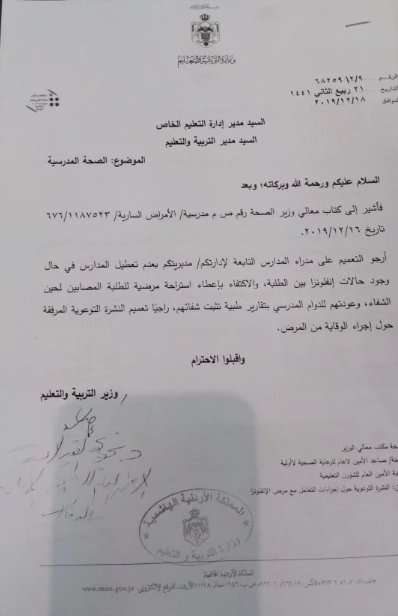 قال الناطق الإعلامي باسم وزارة التربية والتعليم وليد الجلاد ان الوزارة عممت على مديريات التربية والتعليم أنه في حال الاشتباه بجود إصابة بين طلبة المدارس بحالة الإنفلونزا الموسمية يحول الطالب إلى المركز الصحي الذي تتبع له المدرسة، على ألا يعود للدراسة إلا بعد احضاره تقرير طبي يسمح له بالعودة للمدرسة، وذلك للحفاظ على صحية الطلبة وسلامتهم.